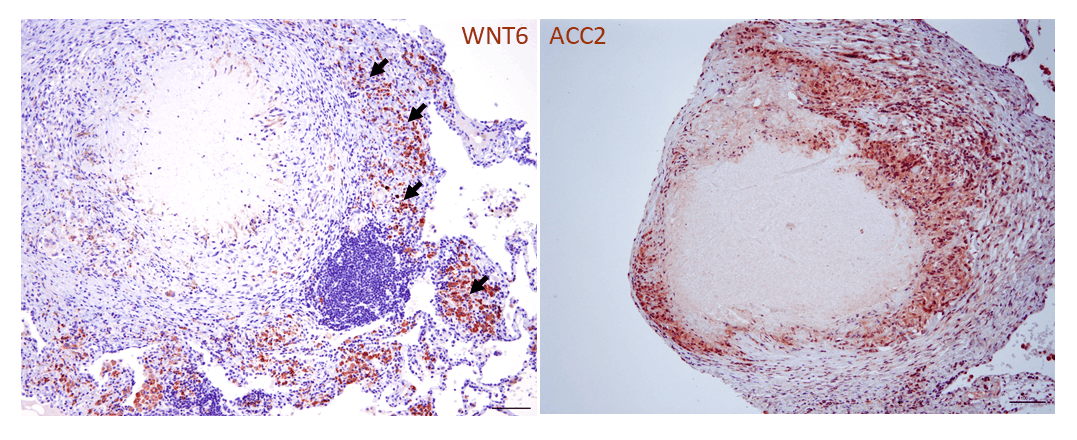 Aufbauend auf unseren früheren Arbeiten zur funktionellen Bedeutung von Muster-Erkennungs-Rezeptoren bei der Infektion mit M. tuberculosis konnten wir durch systematische Analysen mykobakterieninfizierter Makrophagen erstmals regulatorische Funktionen von Komponenten des evolutionär hochkonservierten Wingless/Integrase-1-(WNT-)Signalwegs in der pulmonalen Tuberkulose nachweisen. WNT-Proteine entfalten sowohl pro- als auch antiinflammatorische Effekte auf Makrophagen und andere Zellen des Immunsystems und können darüber hinaus die bakterielle Last während einer Infektion beeinflussen. In diesem Zusammenhang nimmt WNT6 eine besondere Rolle ein. Wir konnten eine ausgeprägte Expression von WNT6 und des durch WNT6 induzierten Enzyms Acetyl CoA-Carboxylase 2 (ACC2) sowohl in granulomatösen Läsionen der Lunge M. tuberculosis-infizierter Mäuse als auch im Lungengewebe von TB-Patientinnen und Patienten nachweisen (Abb. 1a; Brandenburg et al., J. Clin. Invest. 2021). Unter unserer Leitung und in enger Zusammenarbeit mit acht weiteren Forschungsgruppen am FZB konnte dann WNT6 durch umfassende funktionelle Analysen als ein zentraler Regulator der Bildung von Schaum-Makrophagen identifiziert werden. Diese lipidreichen Schaumzellen stellen während der Tuberkuloseinfektion ein zentrales intrazelluläres Habitat für M. tuberculosis dar. Durch die gezielte Modulation der WNT6-induzierten Signaltransduktion, insbesondere durch die spezifische genetische und pharmakologische Inhibition der Acetyl-CoA-Carboxylase 2 (Abb. 1b), gelang es uns, das Wachstum von M. tuberculosis sowohl in vitro als auch in vivo signifikant zu hemmen (Brandenburg et al., J. Clin. Invest. 2021). Die von uns identifizierte gezielte Beeinflussung des Neutrallipidstoffwechsels stellt damit einen vielversprechenden Ansatz für eine neue wirtsspezifische adjuvante Therapie der Tuberkulose dar (erteiltes Patent: Reiling N & Brandenburg J; EP3481392B1). Dieser Themenkomplex wird derzeit in weiterführenden Studien zum Lipidstoffwechsel während der M. tuberculosis-Infektion, unter anderem unter Verwendung von Mausstämmen mit unterschiedlicher Suszeptibilität, weiter vertieft.