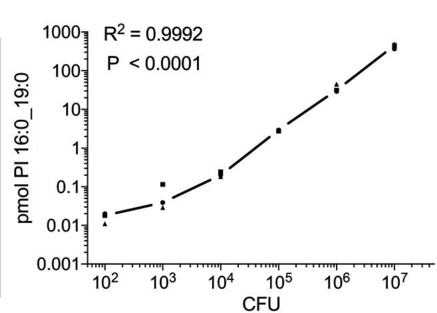 Von translationaler Bedeutung – hier jedoch mit Blick auf die Diagnostik der Tuberkulose – ist zudem der Nachweis spezifischer M. tuberculosis-Lipide, die als Biomarker zur Überwachung der Tuberkulosetherapie eingesetzt werden können. Mithilfe lipidomischer Ansätze und in enger Zusammenarbeit mit der Forschungsgruppe Bioanalytische Chemie konnten wir zeigen, dass Phosphatidylinositole (PI), die Tuberkulostearinsäure (TSA) enthalten, molekulare Marker für eine Infektion mit klinisch relevanten Stämmen des M. tuberculosis-Komplexes darstellen und die bakterielle Last widerspiegeln (Brandenburg et al., ACS Infect. Dis. 2022). Für den am häufigsten vorkommenden Lipidmarker wurden Nachweisgrenzen von ca. 10² bzw. 10³ koloniebildenden Einheiten (CFU) für bakterielle bzw. Zellkultursysteme bestimmt (Abb. 2). Es wurde eine vollständige analytische Methodik einschließlich Probenaufarbeitung entwickelt, die innerhalb eines Tages durchgeführt werden kann und damit etwa 30-mal schneller ist als konventionelle, kultur-basierte Verfahren. Mithilfe dieser indirekten und kulturfreien Nachweismethode konnten wir die Erregerlast in infizierten murinen Makrophagen, humanen Neutrophilen sowie in murinem Lungengewebe bestimmen. Diese aus mykobakteriellen PIs abgeleiteten Markerlipide wurden in höheren Konzentrationen in mononukleären Zellen des peripheren Blutes von TB-PatientInnen nachgewiesen als bei gesunden Kontrollpersonen. Darüber hinaus zeigten sich in einer kleinen Kohorte antibiotika-responsiver TB-PatientInnen zu Therapiebeginn erhöhte Konzentrationen dieser molekularen Marker, die nach erfolgreicher anti-tuberkulöser Behandlung abnahmen. Somit kann die Konzentration von TSA-haltigen Phosphatidylinositolen als Korrelat der mykobakteriellen Last in experimentellen Modellen und in-vitro Systemen dienen und stellt potenziell auch ein klinisch relevantes Instrument zur Überwachung der Krankheitsaktivität bei TB-PatientInnen dar.