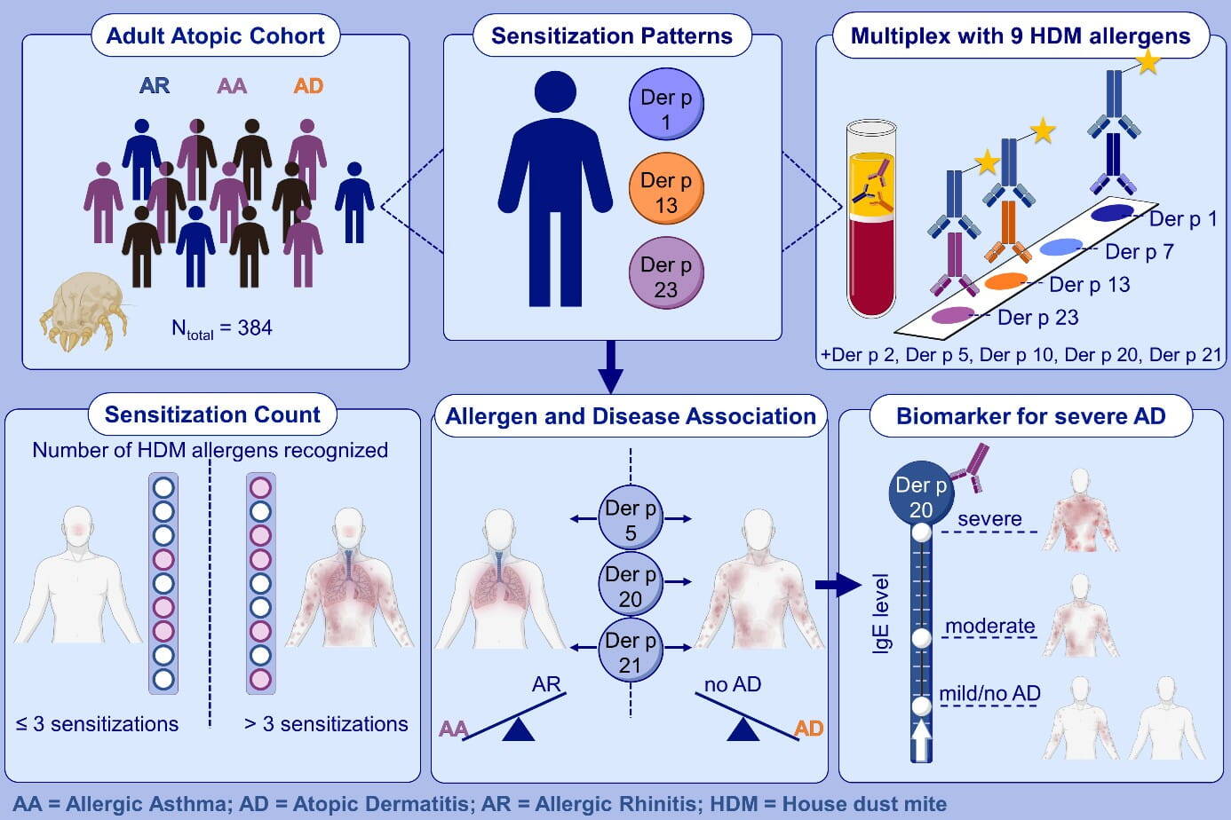 Our group was able to show that sensitization profiles differed between patients with different phenotypes of house dust mite allergy (Figure 2). The corresponding allergens were recombinantly produced in Eschericha coli and purified. IgE-reactivity towards specific allergens was analyzed using a multiplex assay. Different patterns of sensitization to these allergens were observed depending on the phenotype (rhinitis, allergic asthma, and atopic dermatitis). In contrast to patients with rhinitis, asthma patients were sensitized towards more allergens. Based on our results, we can assume that Der p 5 and p 21 are marker allergens for house dust mite-associated asthma. In contrast, significantly more house dust mite allergens were recognized by atopic dermatitis patients, including Der p 5, Der p 21, as well as Der 10, Der p 13 and Der p 20.