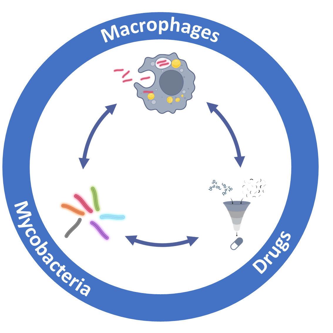 Durch umfassende Studien auf dem Gebiet der Wirt-Erreger-Interaktion haben wir in den letzten Jahren durch M. tuberculosis induzierte Signalwege identifiziert, die mit der Regulation des Lipidstoffwechsels in der Wirtszelle im Zusammenhang stehen. Daher streben wir derzeit die Entwicklung eines innovativen, wirtsgerichteten Therapieansatzes durch den Einsatz neuartiger, hochspezifischer niedermolekularer Inhibitoren an, die auf diese Signalwege abzielen und so den Zugang von M. tuberculosis zu Fettsäuren – seiner bevorzugten Kohlenstoffquelle in vivo – einschränken. Diese Studien umfassen den Einsatz neuartiger fluoreszierender Reporterstämme, Transkriptions-Knockdowns in M. tuberculosis sowie die Nutzung verschiedener zellulärer Modellsysteme. Ein besonderer Fokus liegt auf der Analyse der Biogenese und der Dynamik von Lipidtröpfchen sowie deren Interaktion mit dem Tuberkuloseerreger.