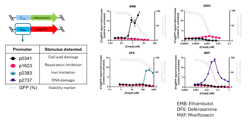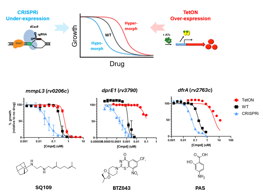 In einem Ansatz erzeugen wir fluoreszierende „Reporter-Stämme“: Dies ermöglichen durch eine transkriptionelle Fusion eines stimulus-spezifisch responsiven Promotors mit einem Fluoreszenzproteingen eine schnelle Bewertung (von 2–3 Tagen) spezifischer, durch neue Wirkstoffkandidaten induzierter Stressantworten im Tuberkuloseerreger (siehe Abb. 3). In einem zweiten Ansatz nutzen wir die gezielte Hoch- und Herunterregulation einzelner Gene zur Analyse der Wirkstoff-Zielstruktur-Interaktion auf Zellebene, basierend auf dem Konzept der differenziellen Wirkstoffsensitivität infolge unterschiedlicher intrazellulärer Zielprotein-Konzentrationen (siehe Abb. 4). In beiden Fällen erweitern wir unsere Stammsammlungen kontinuierlich, um ein möglichst breites Spektrum an Wirkmechanismen und Zielstrukturen untersuchen zu können. Sollten die hier beschriebenen Werkzeuge oder Techniken für Ihre eigene Forschung von Interesse sein oder Sie verfügen über Substanzen, die Sie in Ihrer Wirksamkeit gegen M. tuberculosis charakterisieren möchten, zögern Sie bitte nicht, uns zu kontaktieren. Wir sind stets sehr interessiert daran, neue Kooperationen in der Wirkstoffforschung einzugehen.